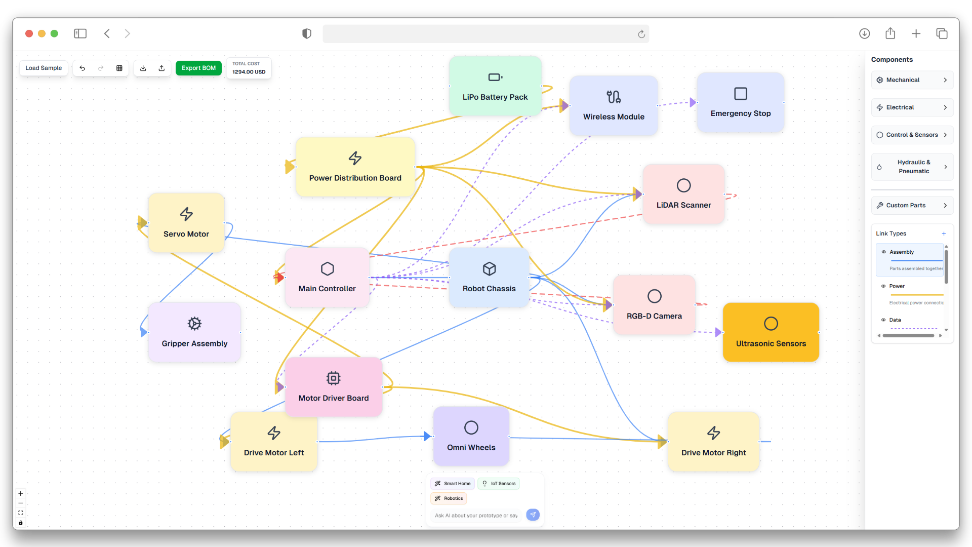 Traditional BOM spreadsheets hide the relationships between your components. Flow shows you the full picture —how parts connect, what they do, and what they cost— all in an intuitive mind map interface.